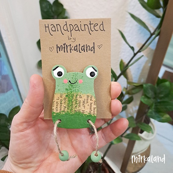 Kézzel festett falemez, akrilfesték, lakk, fém kitűző alap