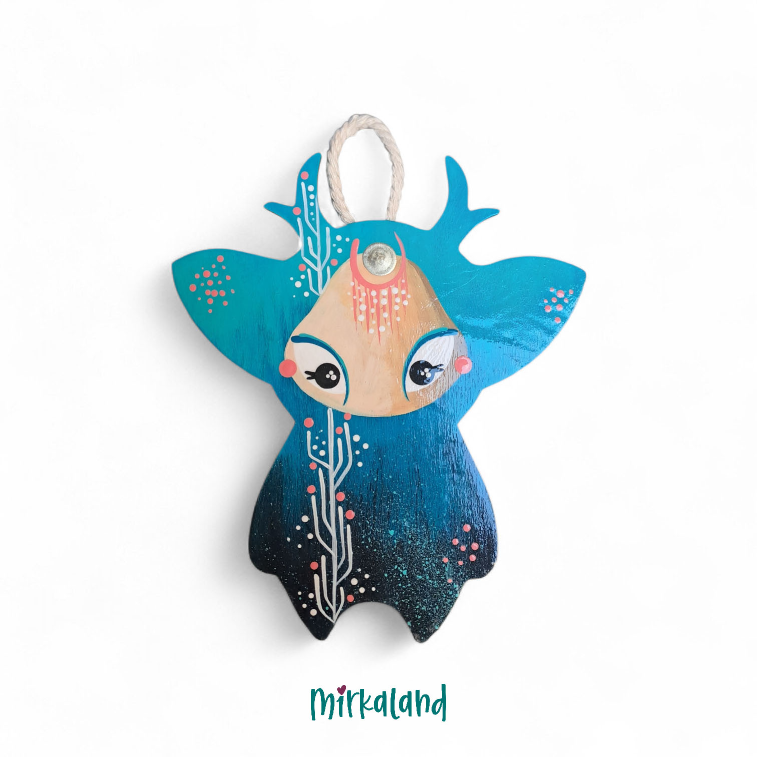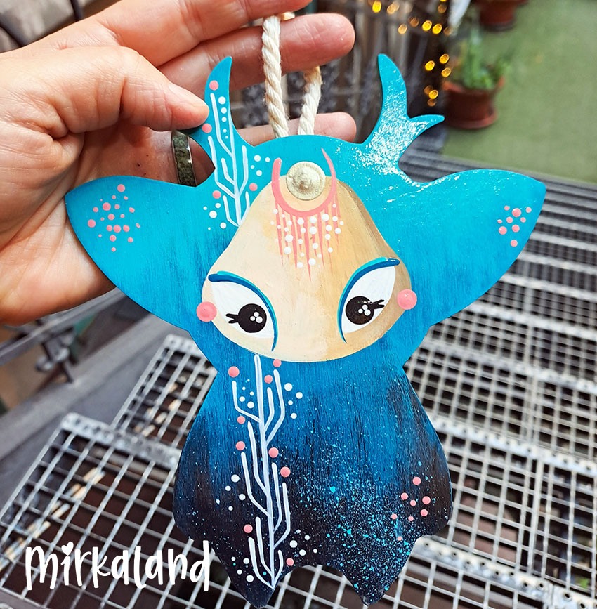 Mély türkiz árnyalatok, apró korall pöttyök és finom, növényszerű minták díszítik ezt a kézzel festett Mirkalurkát. Homlokán egy apró holdfény ragyog, amely csendes, álomszerű hangulatot ad neki. Kedves kis falőrző, aki nyugalmat hoz a térbe.